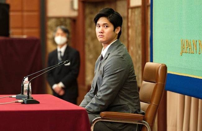 2021年11月15日に日本記者クラブ(東京都千代田区)で会見を行った米大リーグ・エンゼルスの大谷翔平選手。会見での記者による質問が「グダグダ」だったとして、批判が相次いでいる。