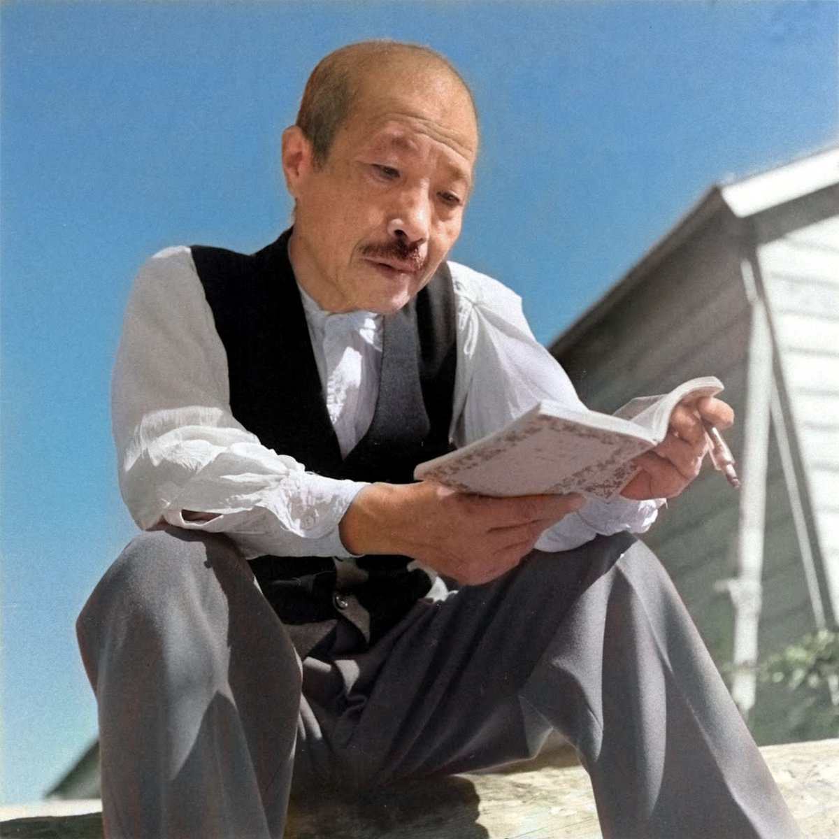 大森捕虜収容所、屋外で読書する東條英機。何の本を読んでいるのだろうか。白黒写真をカラー化。