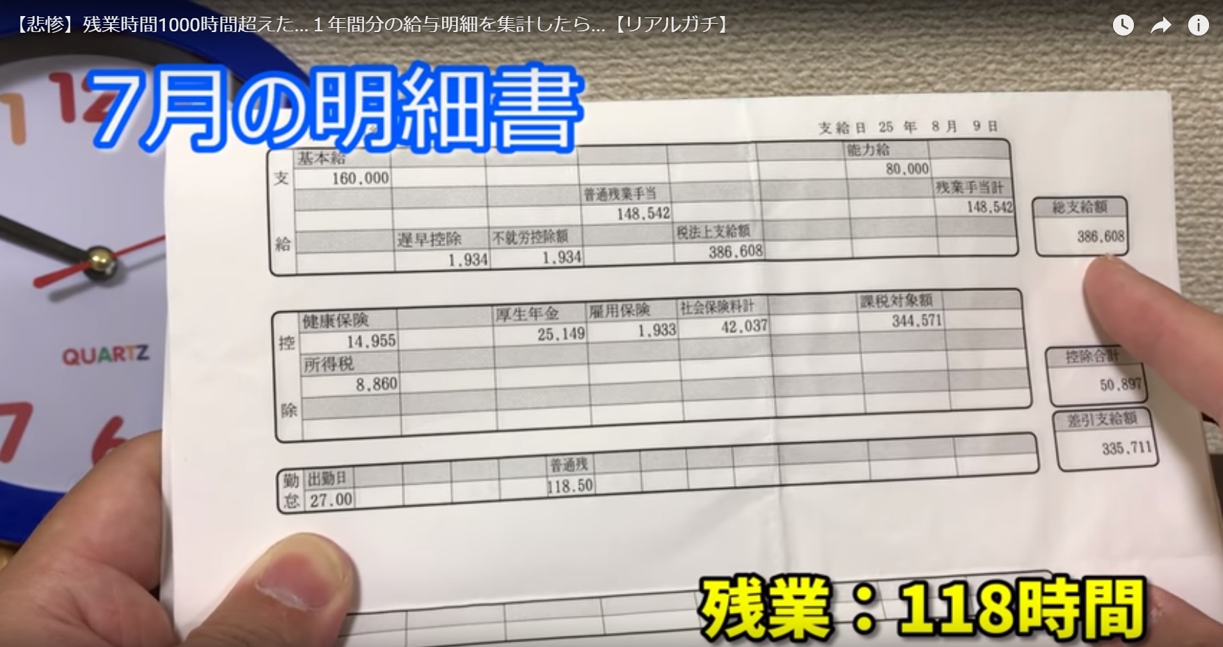 【画像あり】一ヵ月に4日間しか休めなかった人の給与明細を発見