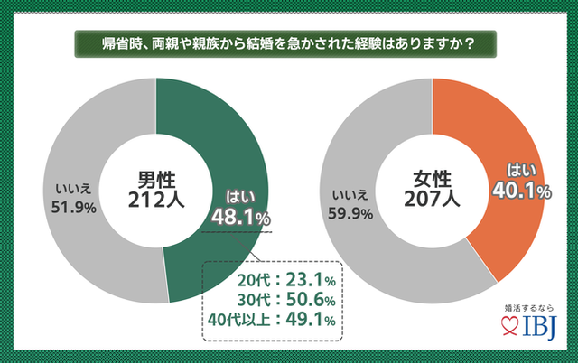 独身時代についてうかがったところ、 男性の半数、 女性の4割が、 年末年始の帰省時に両親や親族から結婚を急かされた経験があると回答。