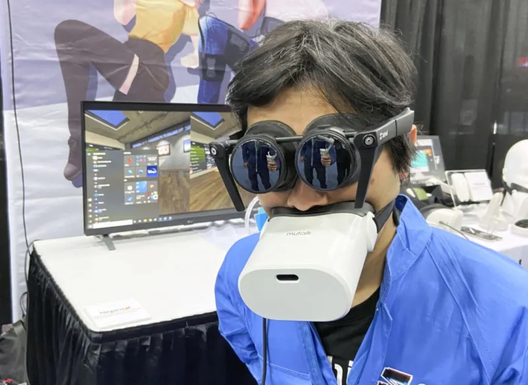 公開したヘッドセット「メガーヌエックス」は、高精細な有機EL画面を採用。重量を230グラム以下に抑えた。10万円を下回る価格で販売する。