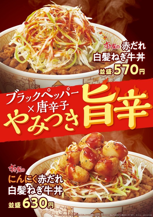 株式会社すき家(代表取締役社長:浅沼 幹典 本社:東京都港区)が展開する牛丼チェーン店「すき家」では、赤だれ白髪ねぎ牛丼(並盛:税込570円)」「にんにく赤だれ白髪ねぎ牛丼(並盛:税込630円)」を全国の約2,000店舗で販売します。やで