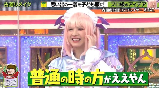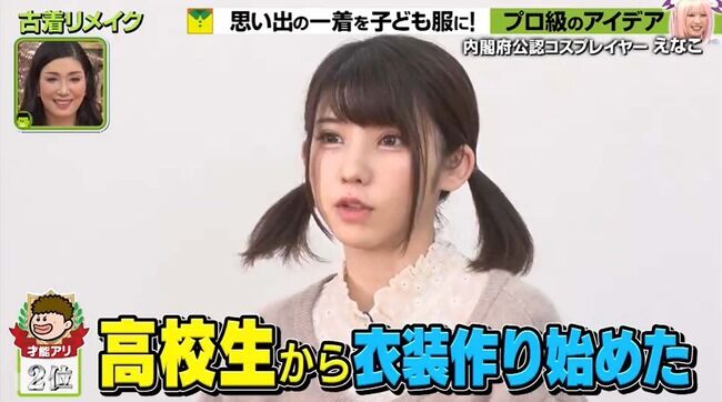 えなこは「古着リメイク」コーナーに登場。見事才能あり2位に選ばれた。中学からコスプレを始め、高校生から自分で衣装を作り始めたといい「何も着てない状態でミシンの前でガーッと縫って、それを体に当てて、また縫って当ててを繰り返してました」と説明していた。