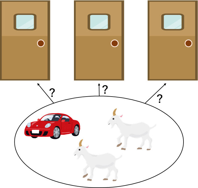 1つのドアの後ろには当たりである「新車」が、2つのドアの後ろには、はずれである「ヤギ」が用意されています。当たりを選べれば「新車」が手に入ります。