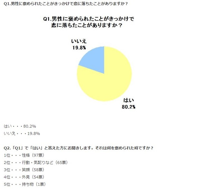 女性の80%が「褒められたことがきっかけで恋に落ちたことがある」と回答。