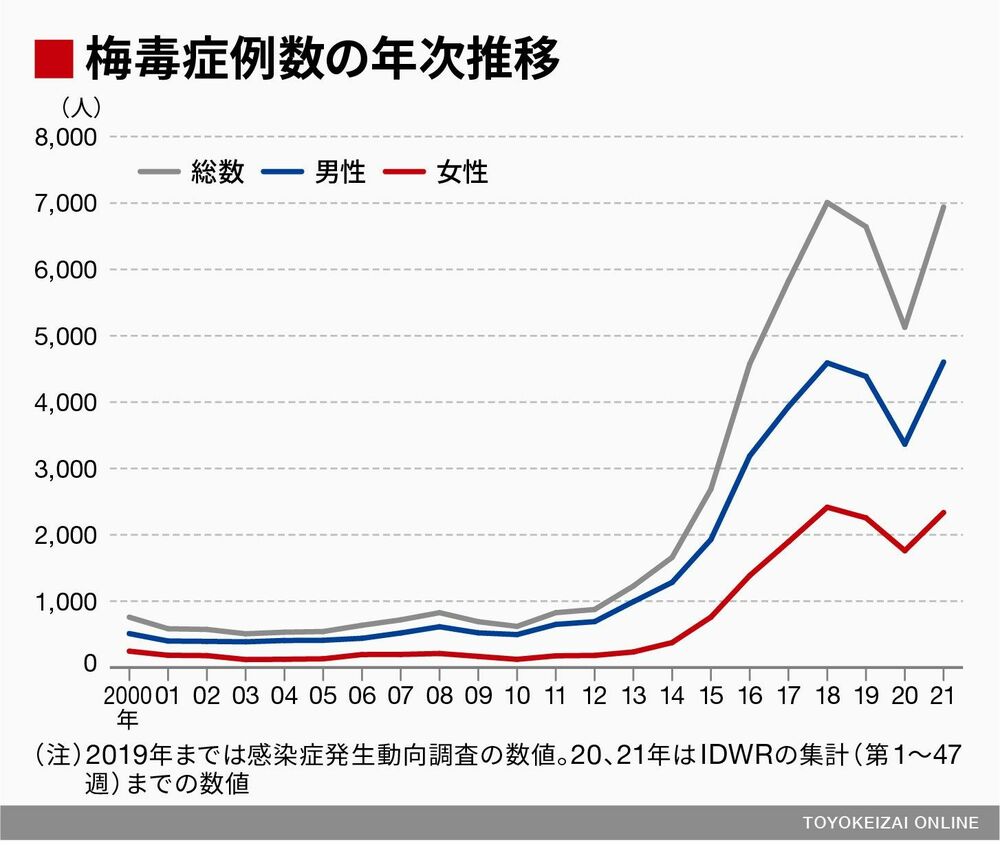 近年、梅毒が増えた背景として、SNSなどの利用により気軽に性行為が行われるようになったことや、性行為の多様化が進んだことなどが挙げられているが、意外なことに、梅毒以外の性感染症(淋病や性器クラミジア感染症、エイズなど)は増えていない。