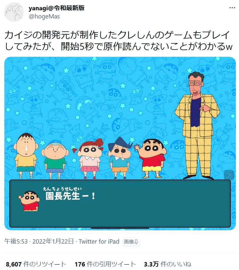 「クレヨンしんちゃん」のゲーム、開発元が原作を全く知らないwwwwwwww 2022/1/23 哲学ニュースnwk 1: 風吹けば名無し 2022/01/23(日) 18:22:35.02 ID:VusyzRDD0 続きを読む Source: 哲学ニュースnwk