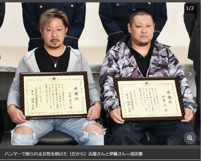 富里市で昨年発生した殺人未遂事件で、成田署はハンマーで殴られている女性を助け、容疑者の男を現行犯逮捕したとして、いずれも同市に住む古屋直人さん(36)と伊藤亘さん(40)に感謝状を贈った。