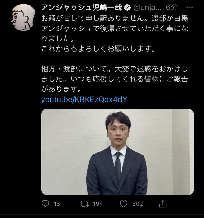 これからもよろしくお願いします。相方・渡部について。大変ご迷惑をおかけしました。いつも応援してくれる皆様にご報告があります。https://t.co/suvXLa6K9b pic.twitter.com/ujSqBk4Txv