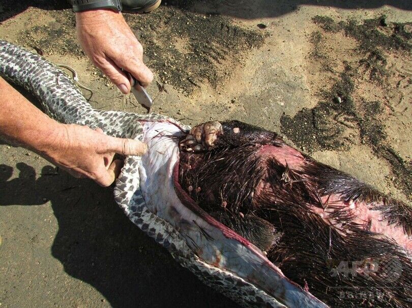 エランド湖動物保護区(Lake Eland Game Reserve)のジェニファー・フラー(Jennifer Fuller)氏はAFPの取材に、通常であれば、このニシキヘビはヤマアラシを消化できていただろうと語った。だがこのヘビはヤマアラシを吐き出そうとして、トゲが刺さって死んだという。