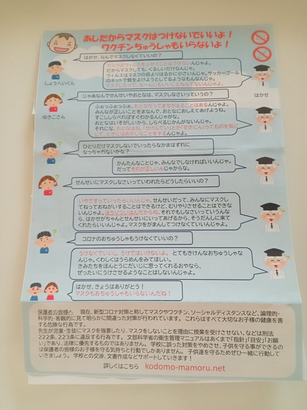 息子が下校中に学校近くで「大事なお手紙だから封筒はお家の人に渡してね」といって配られたと。通学路歩いている子みんなもらってたから息子も流れでもらったらしい。