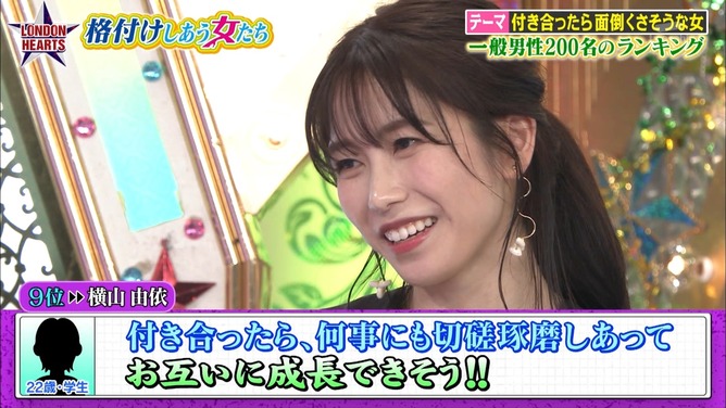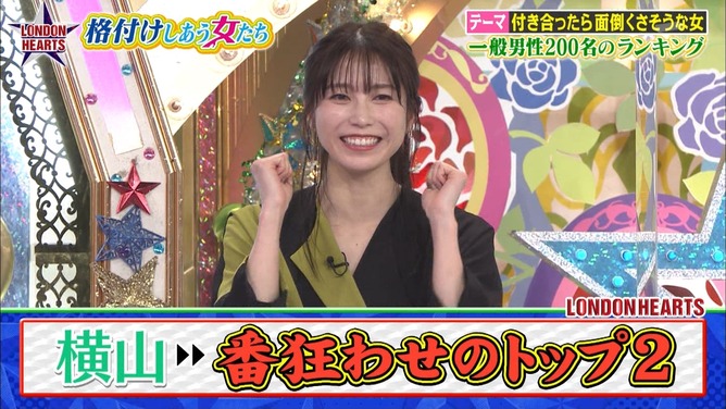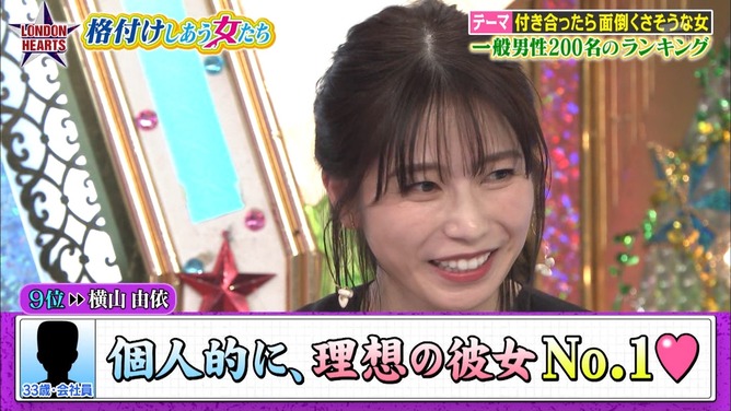 “みちょぱ”こと池田美優は「面倒くさそうな女」として横山を挙げ、「やっぱりアイドルが長かった分、恋愛経験がほぼほぼ無いわけじゃないですか。29くらいでたぶん初めて(恋愛を)経験すると、いろいろと面倒くさいというか。もちろんたぶん気持ちも入りすぎて、重たくなっちゃったりもするだろうし、なんか落ち込んだらすごい深そうだし」とコメント。