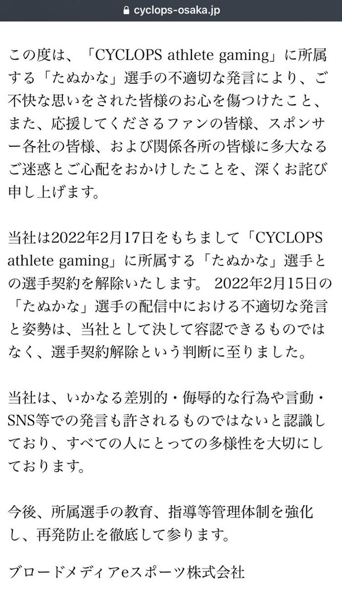— CYCLOPS athlete gaming (@CYCLOPS_OSAKA) February 17, 2022
