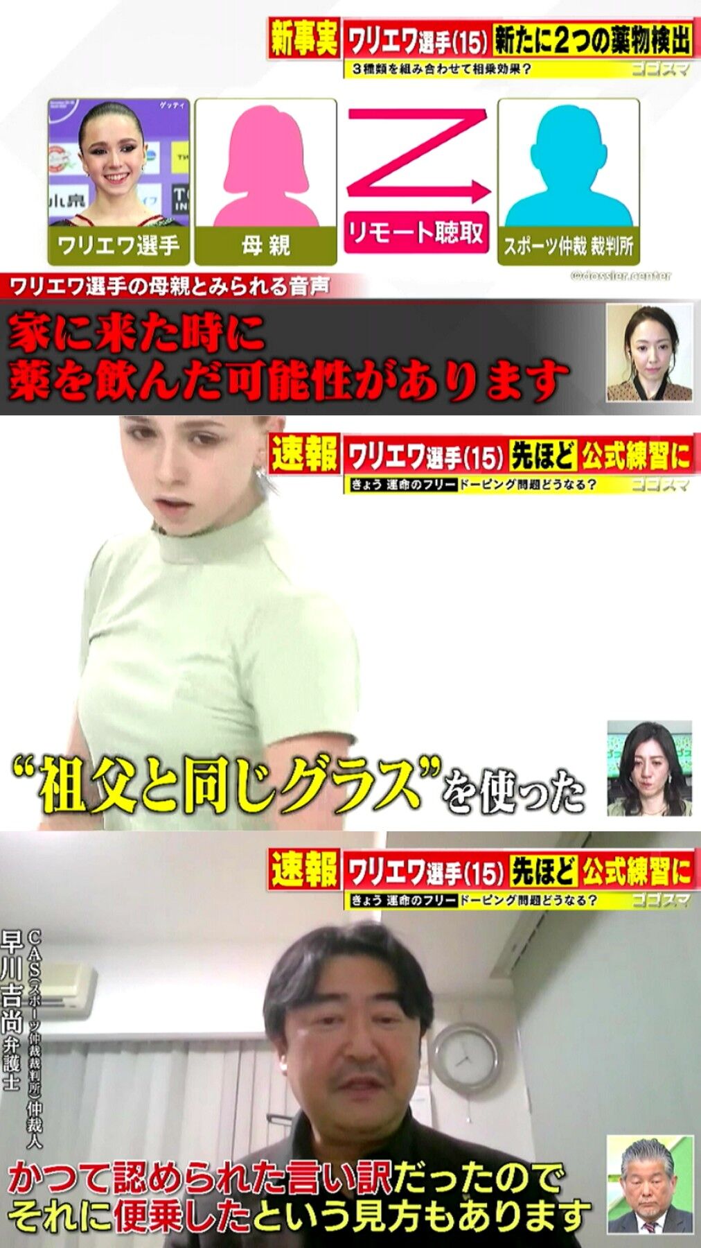 ワリエワはスポーツ仲裁裁判所(CAS)聴聞会で祖父の心臓治療薬のためだと抗弁した。祖父と同じコップを使用し、祖父の心臓病治療薬の成分がワリエワの尿サンプルから検出されたということだ。タイガート委員長は「ワリエワの尿サンプルから検出されたトリメタジジンの濃度は1ミリリットルあたり2.1ナノグラムと分析された」とし「これはサンプル汚染と判明した他のスポーツ選手のサンプルと比較して約200倍多い量」と指摘した。