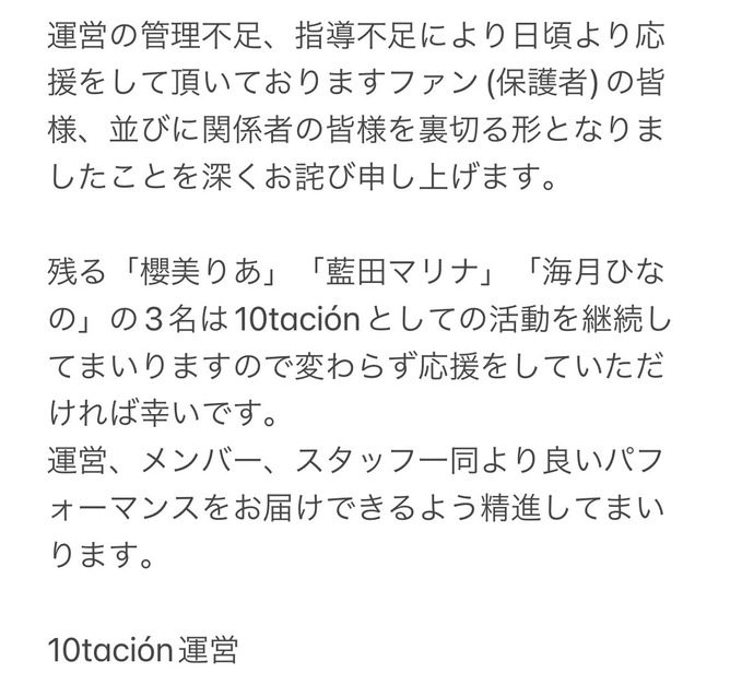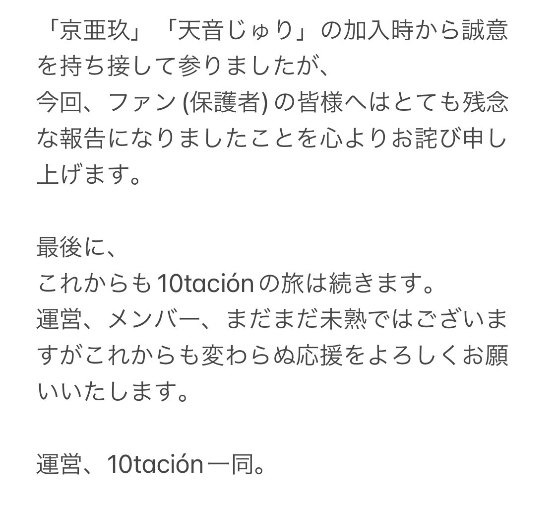 10tacionが2022年2月15日(火)付で京亜玖・天音じゅりに対してマネジメント契約解除処分としたことを公式Twitterアカウントで発表した。