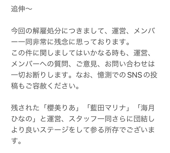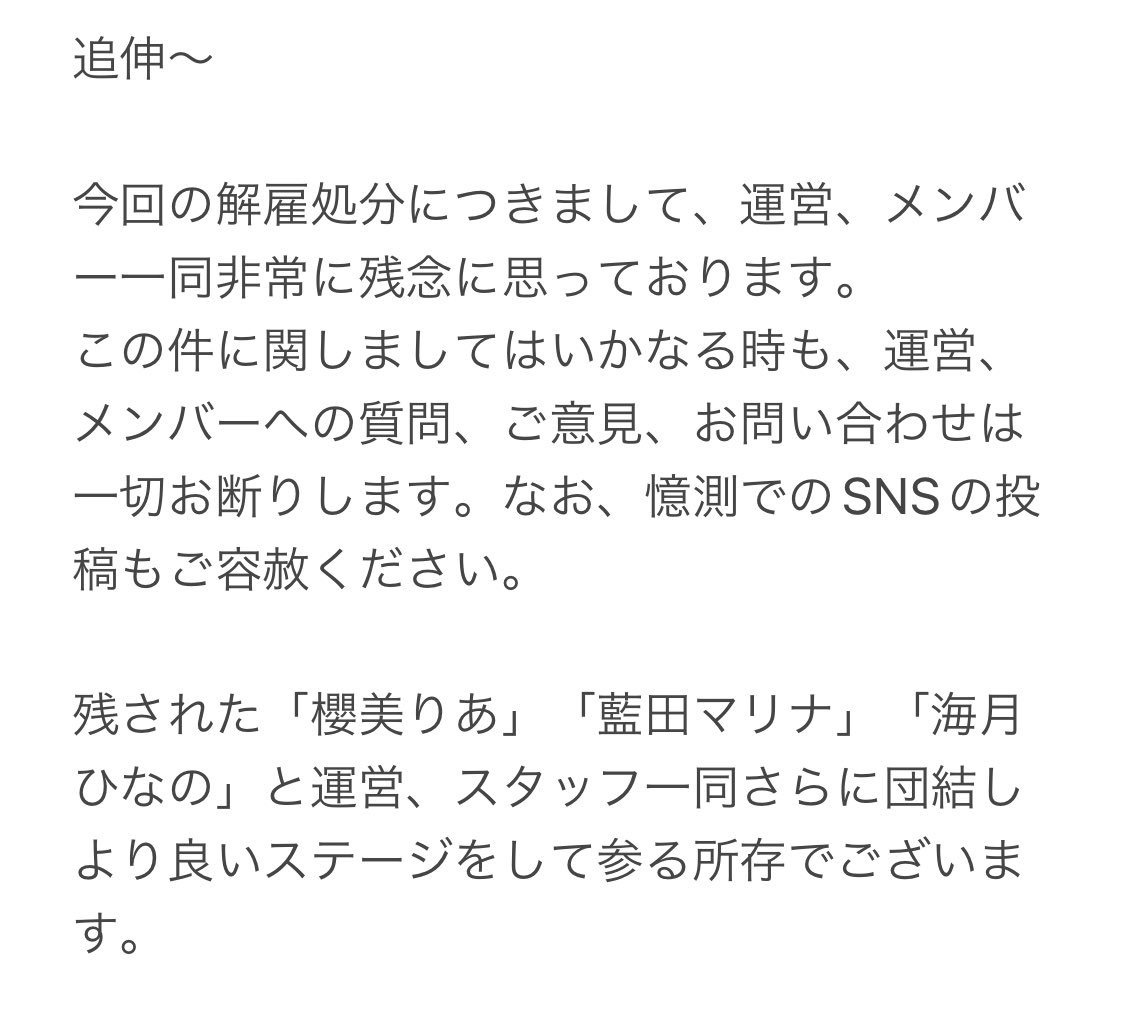 理由について、公式Twitterアカウントの発表では「重大な契約違反が発覚」と説明。