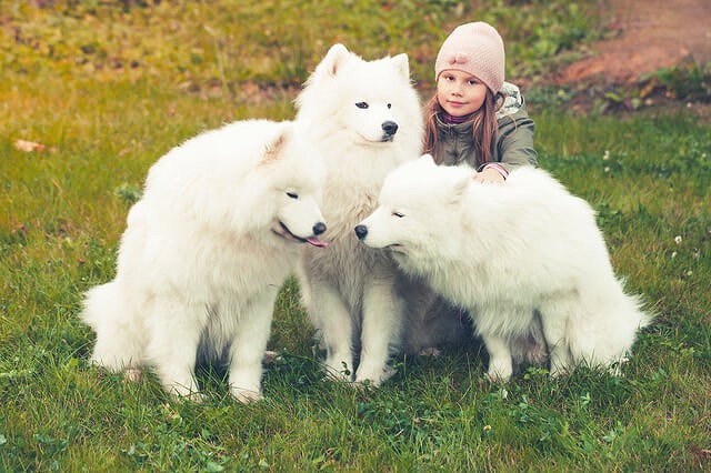 しっかりと立ち上がったやや短い耳、適度な長さの鼻筋、微笑んでいるかのような黒目の顔立ちが魅力的で、愛好家の間では、そのいつも笑っているような口元をサモエドスマイルと呼び親しまれている