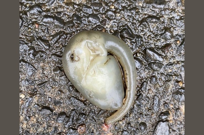 濡れた路面に横たわるその姿は、オタマジャクシやイカのようですが、どちらともまったく違います。