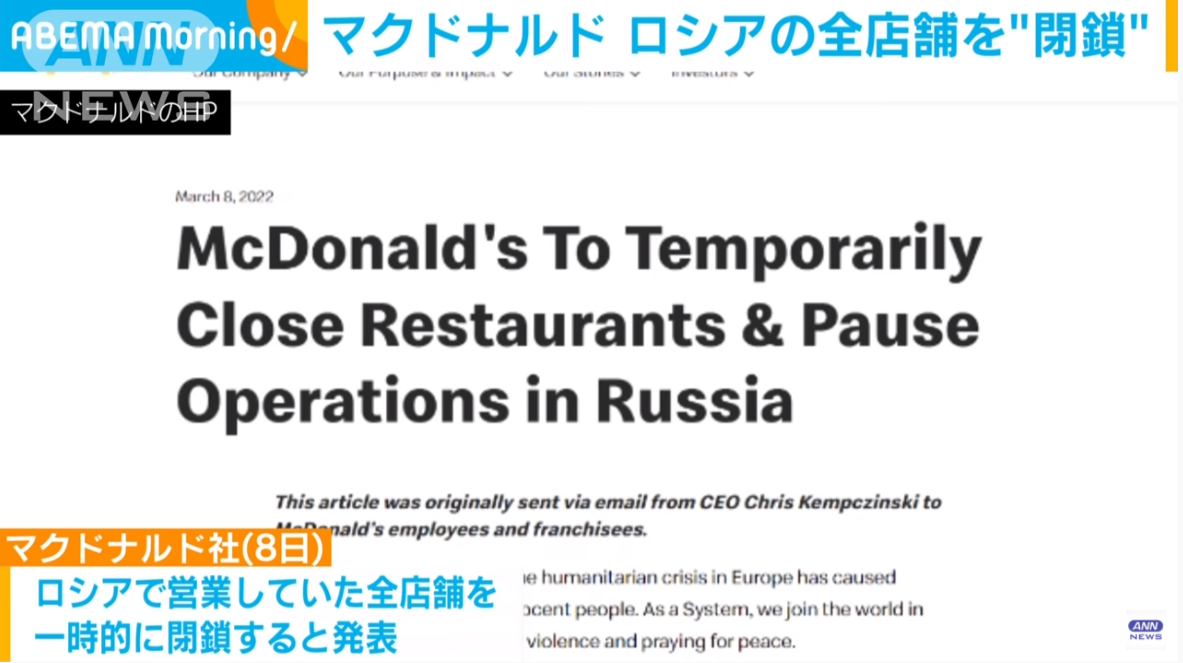 マクドナルド「ロシアの全850店舗を閉鎖する。従業員62000人の給与は支払い続ける」