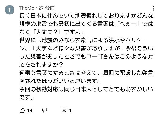 配信中に遭遇した地震に対して「へぇ~」と冷めた反応したせいで視聴者から批判の集中放火