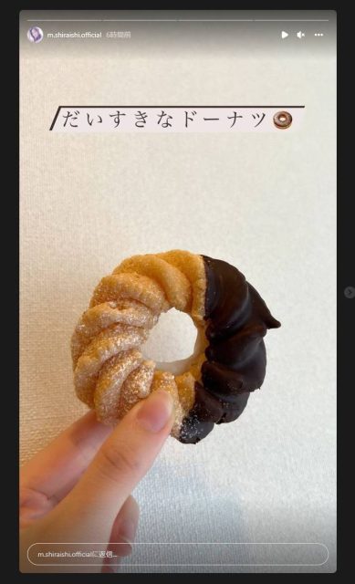 白石麻衣は26日、「だいすきなドーナツ」というメッセージを添えて、ミスタードーナツのエンゼルフレンチの写真を投稿。2枚目には「おいしい」との言葉を添えて食べかけのドーナツの写真を、3枚目には「あと一口」として、残りわずかになったドーナツの写真を投稿しました。