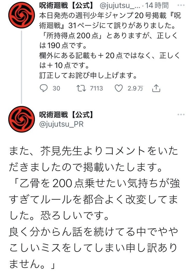 良く分からん話を続けてる中でややこしいミスをしてしまい申し訳ありません。」— 呪術廻戦【公式】 (@jujutsu_PR) April 17, 2022