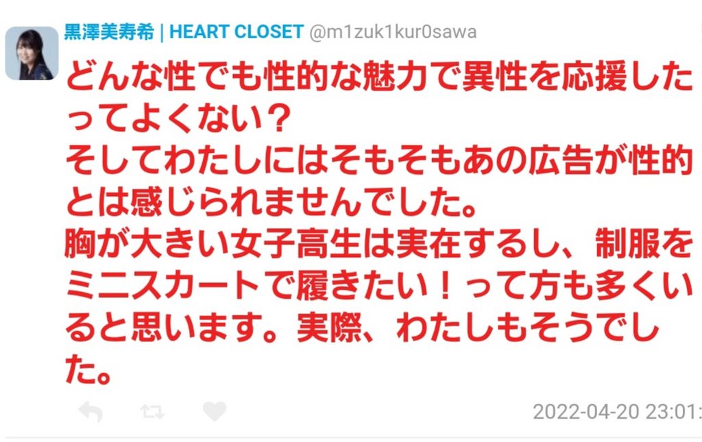 胸の大きい女性向けブランド・ハートクローゼット(ハトクロ)の黒澤美寿希さんが『月曜日のたわわ』を擁護し、ブランド愛用者らがショックを受ける