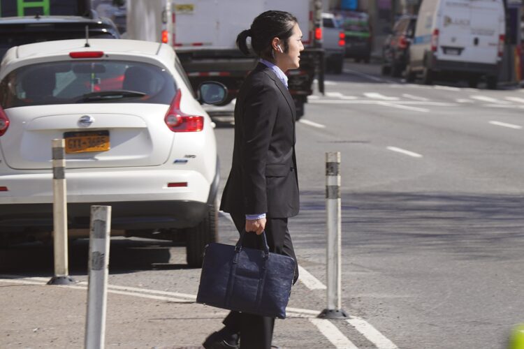 片手に持つ青いビジネスバッグは、大阪府に本社を置く鞄メーカー「十川鞄」によるブランド「ビーシーイシュタル (B.C.+ISHUTAL)」のものだろう。
