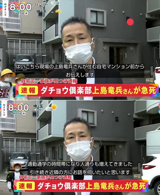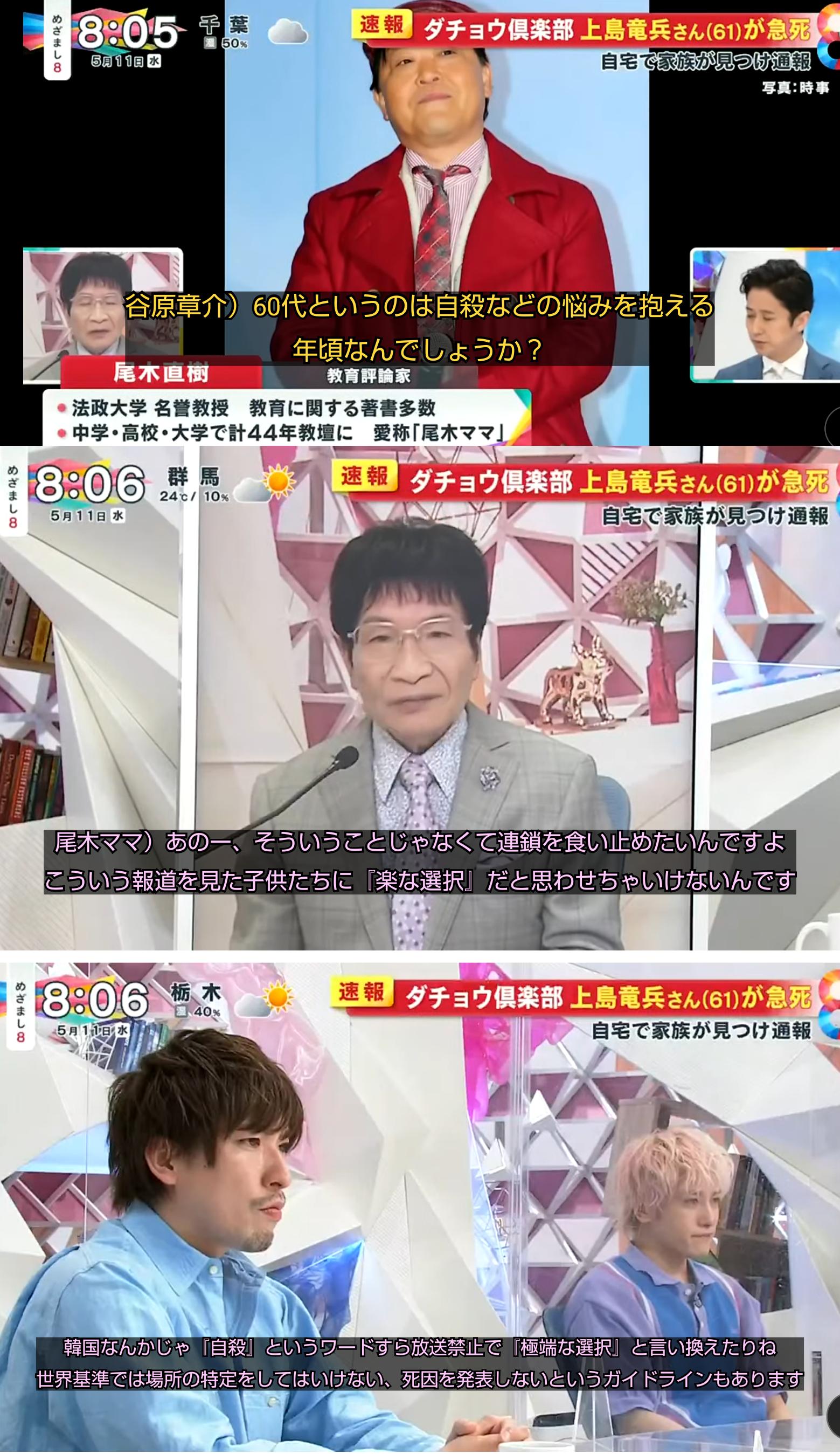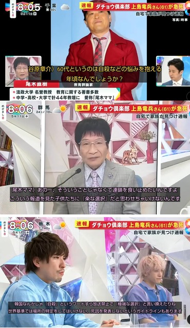 フジテレビ、ネタが入って他局を出し抜こうと慌てて速報うって自殺と明確に死因まで報道して、更には何をトチ狂ったか自宅前中継してしまうも、生出演中の尾木ママに報道姿勢非難されて、徐々に冷静になって自宅前中継は中途半端に打ち切られた模様