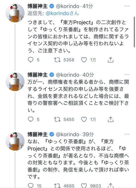 もちろん、ゆっくり実況やゆっくり解説等の使用にも及ばないのは言うまでもありません。— 博麗神主 (@korindo) May 20, 2022