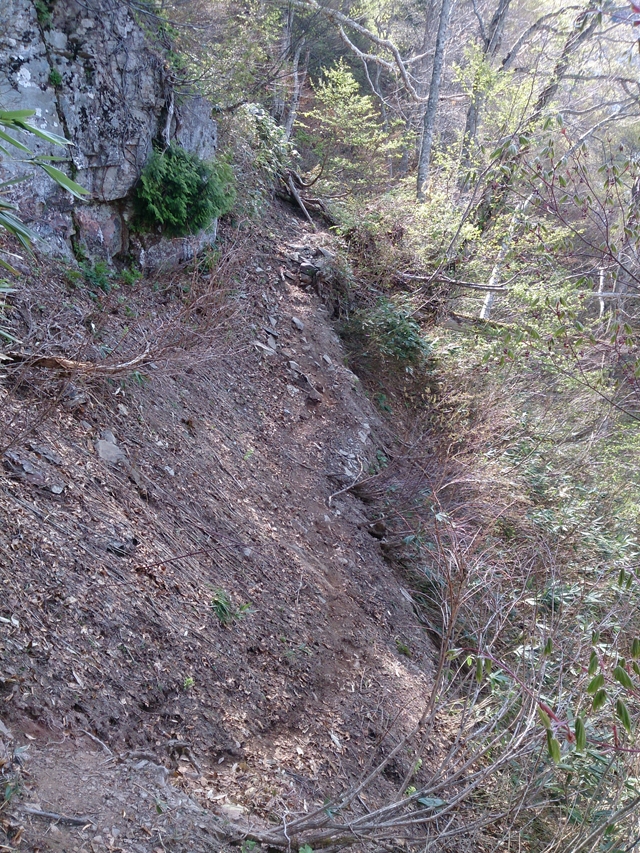 そして残雪があると正しい登山道が分からなくなります。下の画像は今回の件でよく見る画像ですので知っている方も多いかも知れませんが、説明すると、左の木に隠れ見え難い道が正規の登山ルートで、右の残雪のあるルートは間違いで、そちらに進むと道迷いで終わりです。