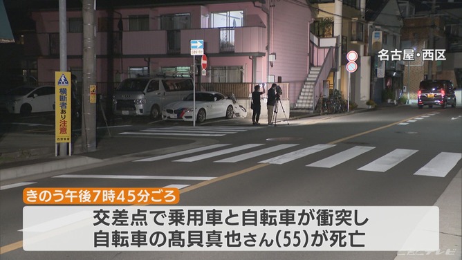 5月31日午後7時45分ごろ、名古屋市西区児玉二丁目の信号のない交差点で、軽乗用車と自転車が衝突し、自転車に乗っていた名古屋市中村区の会社員高貝真也さん(55)が死亡しました。