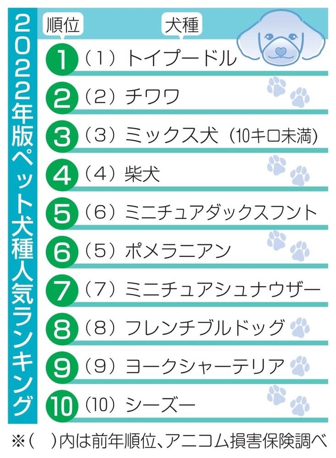 ペット保険大手のアニコム損害保険(東京)は22日までに、2022年版のペット犬種の人気ランキングを発表した。トイプードルが13年連続となる1位を獲得。チワワが2位、異なる種を掛け合わせたミックス犬が3位だった。屋内で飼いやすい小型犬がランキング上位を占めたが、中型犬も柴犬が4位、フレンチブルドッグが8位と底堅い人気を集めた。