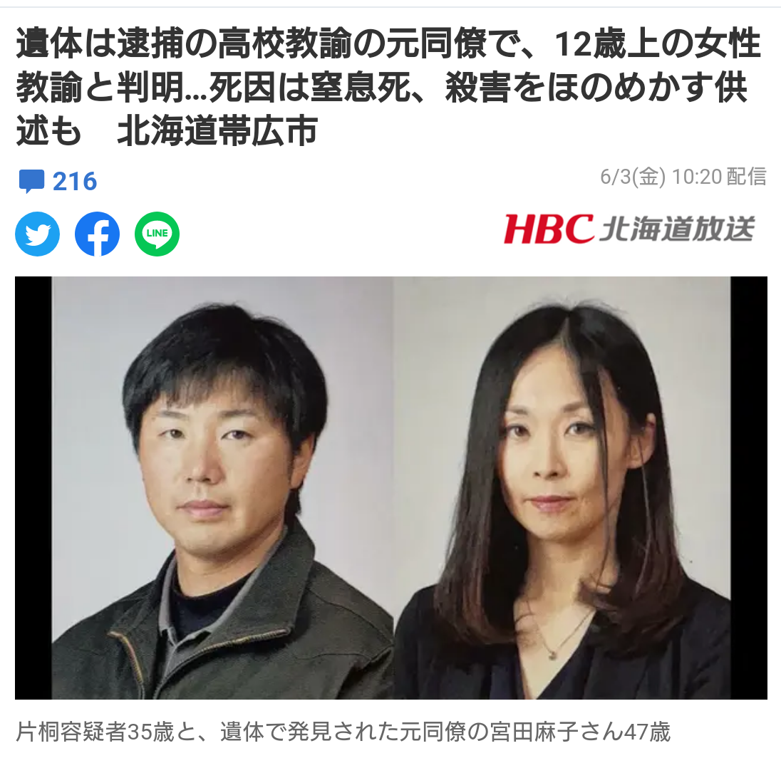 その後の調べで、遺体は、3月までオホーツク地方の高校で片桐容疑者の同僚だった、教諭の宮田麻子さん47歳と判明しました。