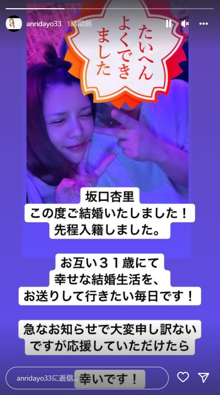 坂口杏里さん 結婚を発表「先ほど入籍しました」 インスタグラムで報告「お互い31歳…幸せ」
