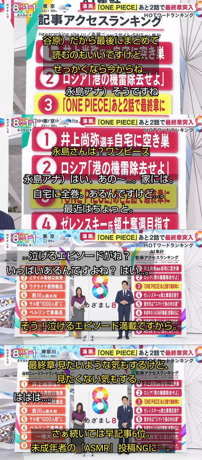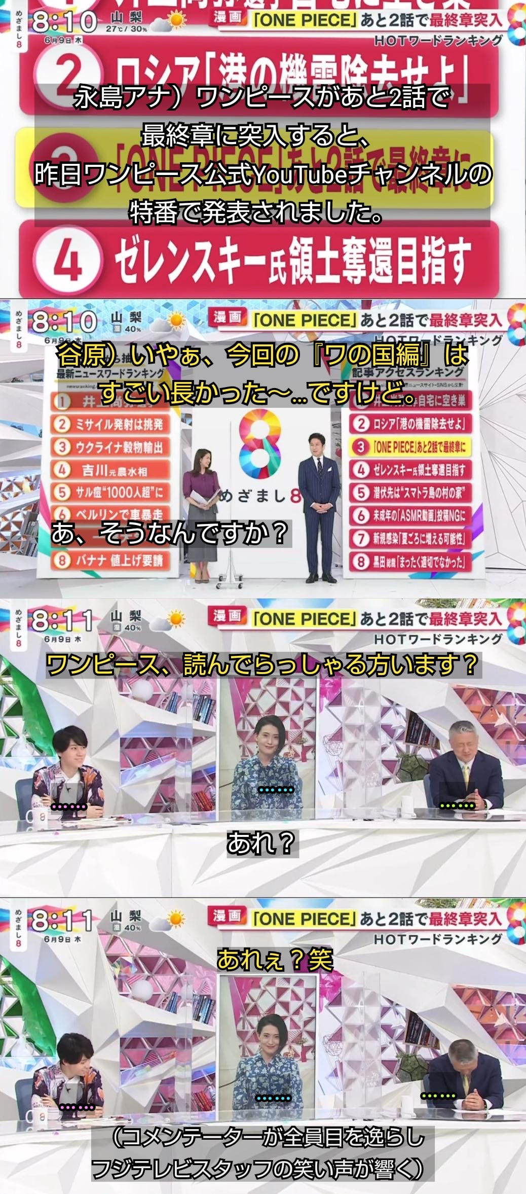 番組では「ワンピースがあと2話で最終章に突入する」とのトピックを取り上げた。司会の谷原章介さんが「今回の『ワノ国編』はすごい長かったですけど、読んでいらっしゃる方います? ワンピース」と話を振ると、大空さんは苦笑し頭を下げた。