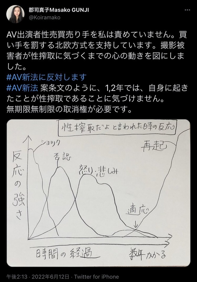 AV出演者性売買売り手を私は責めていません。買い手を罰する北欧方式を支持しています。撮影被害者が性搾取に気づくまでの心の動きを図にしました。#AV新法に反対します #AV新法 案条文のように、1,2年では、自身に起きたことが性搾取であることに気づけません。