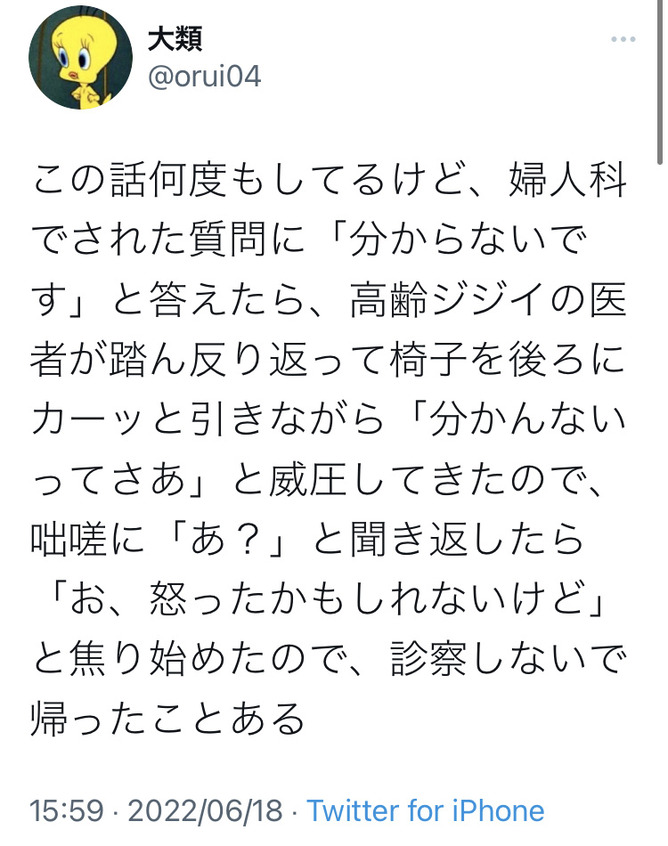 この話何度もしてるけど、婦人科でされた質問に「分からないです」と答えたら、高齢ジジイの医者が踏ん反り返って椅子を後ろにカーッと引きながら「分かんないってさあ」と威圧してきたので、咄嗟に「あ?」と聞き返したら「お、怒ったかもしれないけど」と焦り始めたので、診察しないで帰ったことある