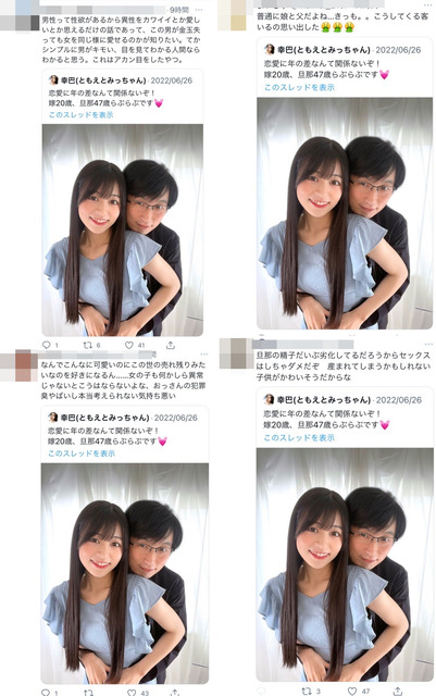 嫁20歳、旦那47歳らぶらぶです?? pic.twitter.com/F5e89kaYSy— 幸巴(ともえとみっちゃん) (@_tomoe_0722) June 26, 2022
