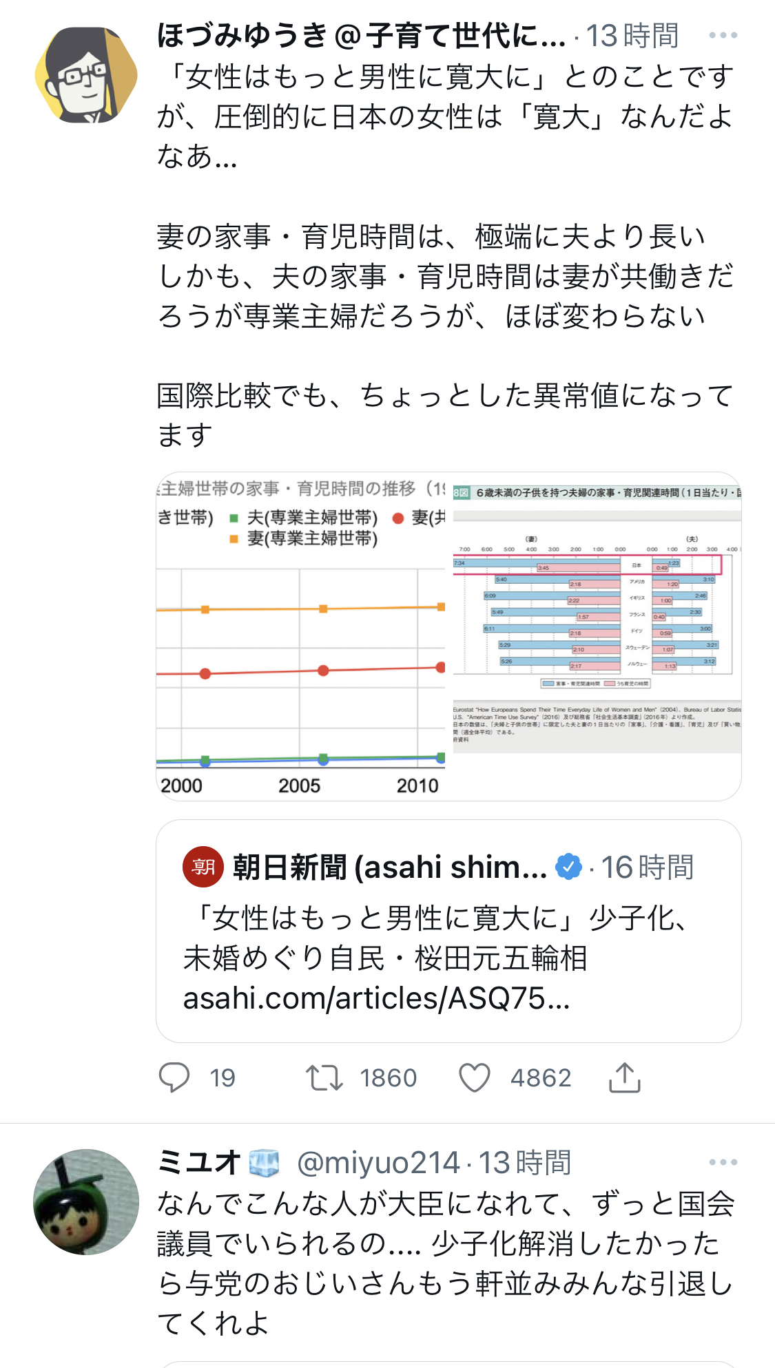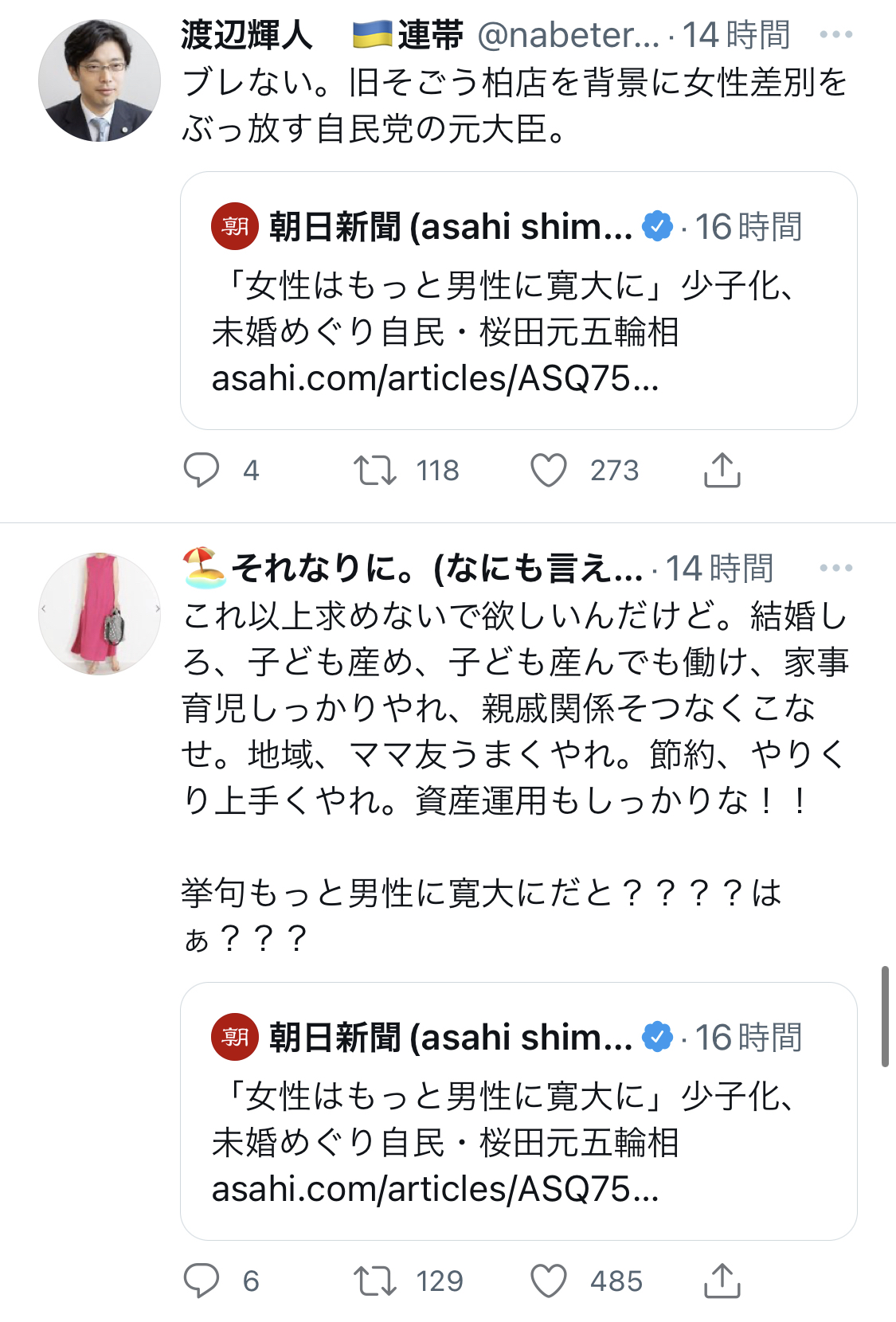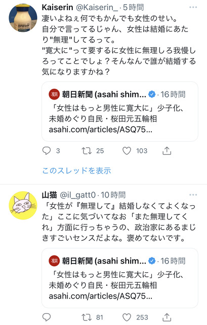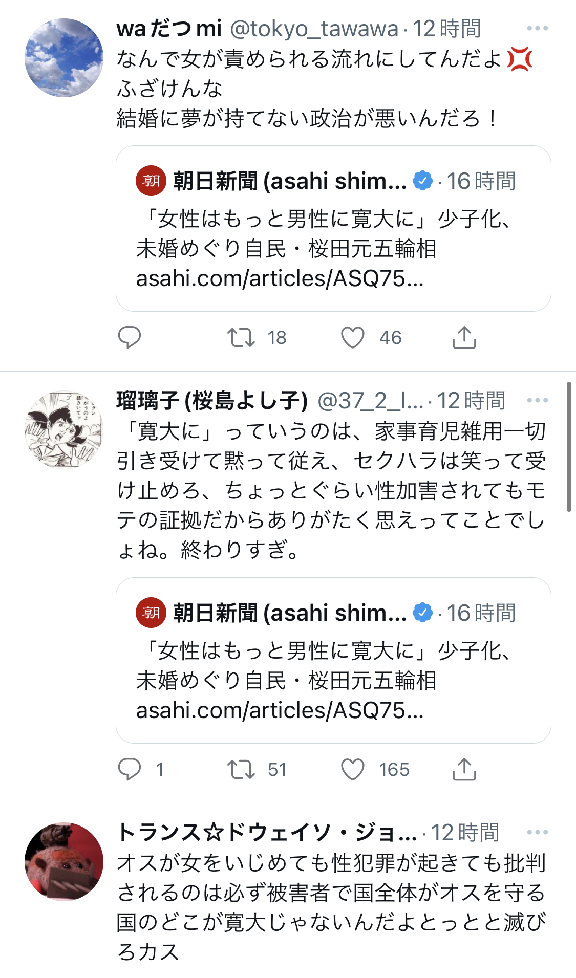 「女性はもっと男性に寛大に」少子化、未婚めぐり自民・桜田元五輪相 https://t.co/YAJHFQzV3S