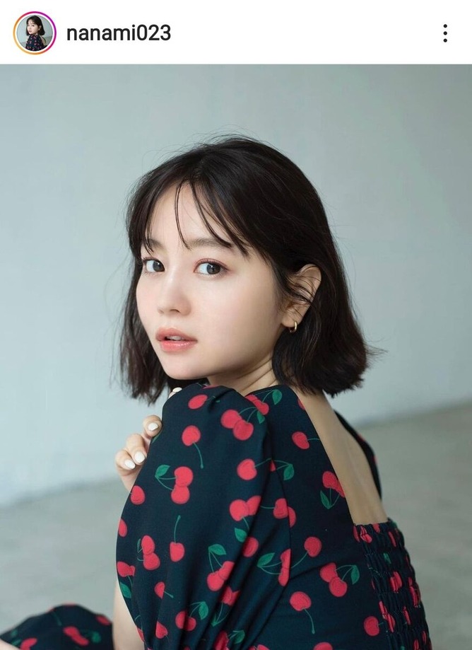ファンクラブの撮影ショットで「アザーカットを特別に~」とアップしたのは、黒髪ボブが可愛い振り向き姿。背中が大きく開いたチェリー柄のワンピースが、キュートな印象のNANAMIにピッタリだ。