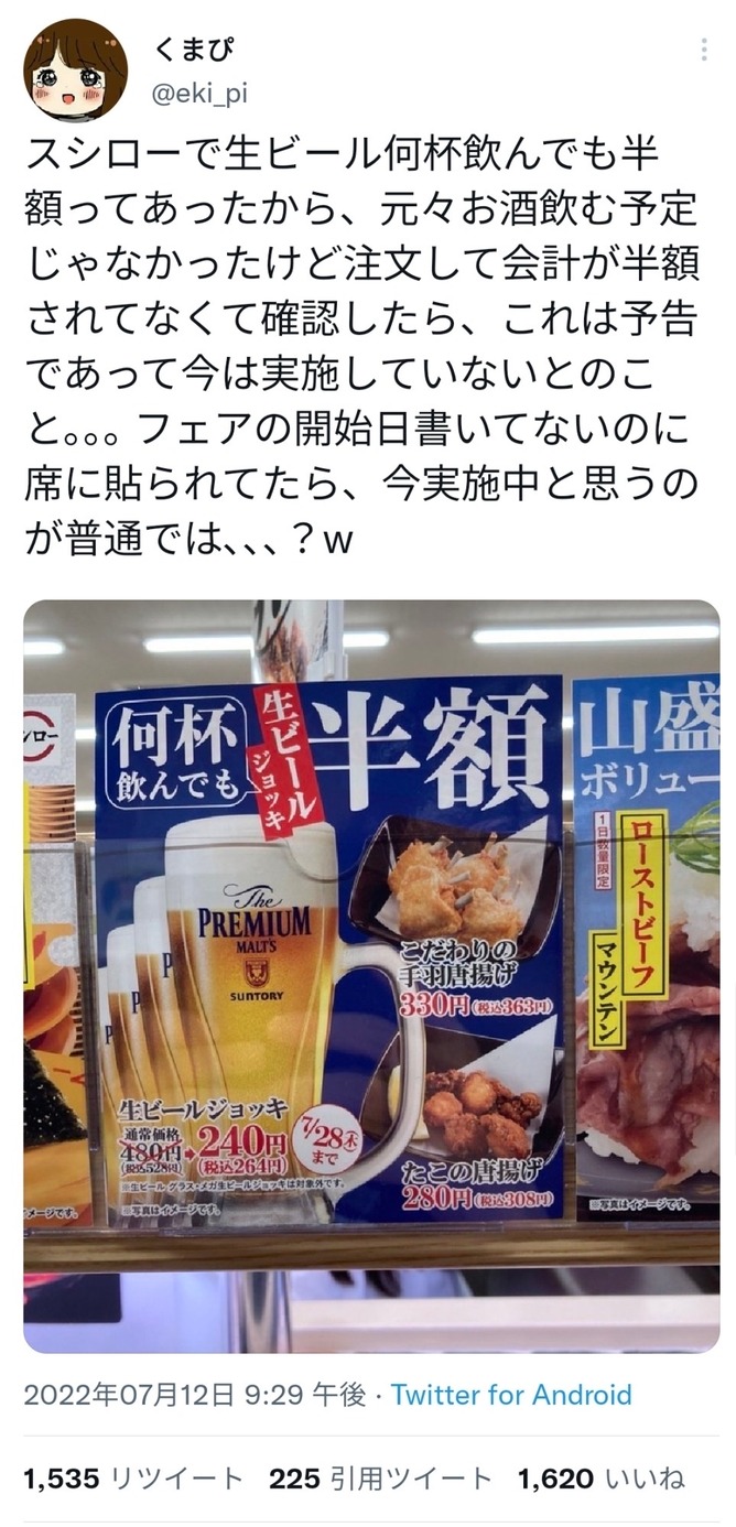 スシローで生ビール何杯飲んでも半額ってあったから、元々お酒飲む予定じゃなかったけど注文して会計が半額されてなくて確認したら、これは予告であって今は実施していないとのこと。。。 フェアの開始日書いてないのに席に貼られてたら、今実施中と思うのが普通では、、、?w pic.twitter.com/cru1bMO69J
