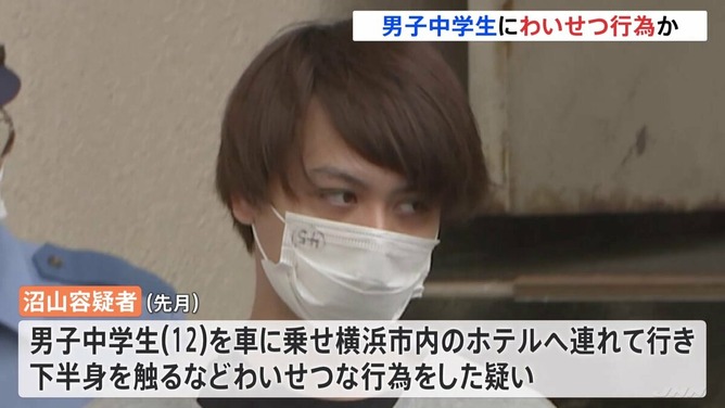 わいせつ目的誘拐などの疑いで逮捕されたのは、横浜市戸塚区の自称介護士・沼山凱人容疑者(24)で、先月、中学1年生の12歳の男子生徒を車に乗せ横浜市内のホテルへ連れて行き、下半身を触るなどわいせつな行為をした疑いが持たれています。