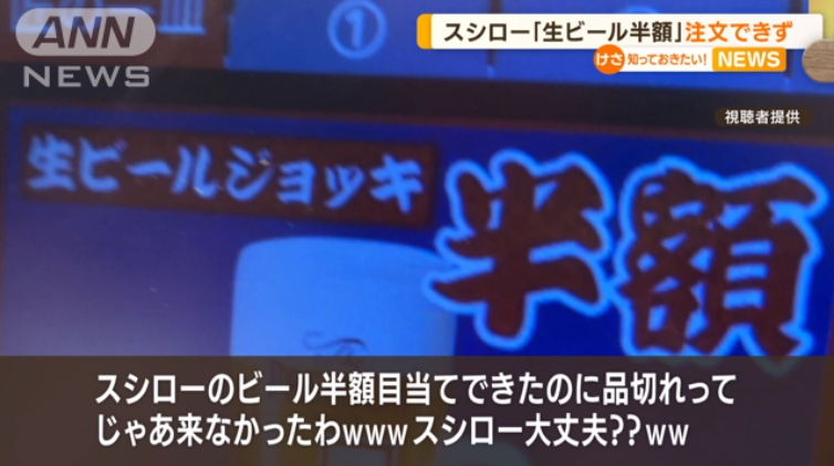 【悲報】 スシロー半額ビール売り切れで注文できず、開店直後に売り切れの店舗も