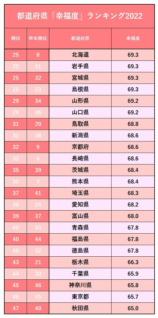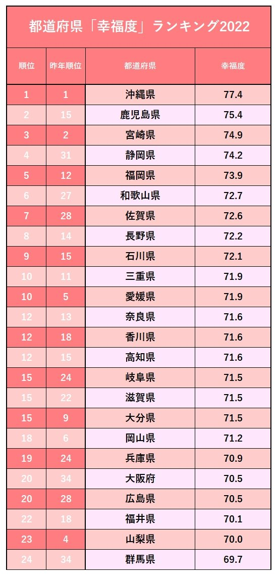 どうせ沖縄が一番上で都会代表の東京と田舎代表の秋田が一番下のランキングやろ