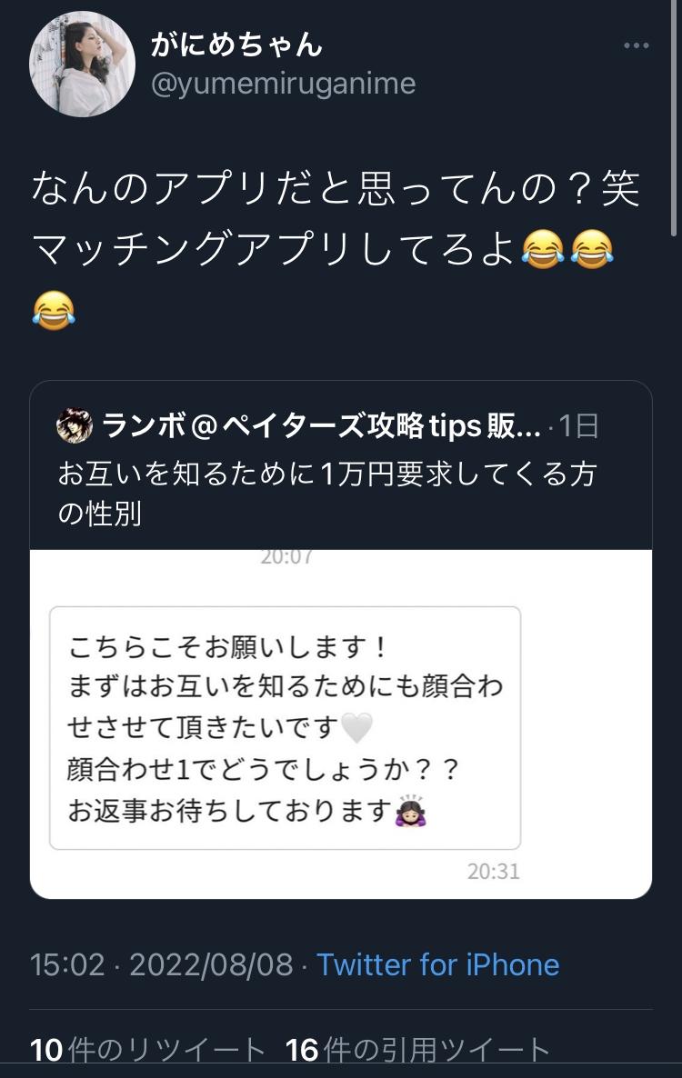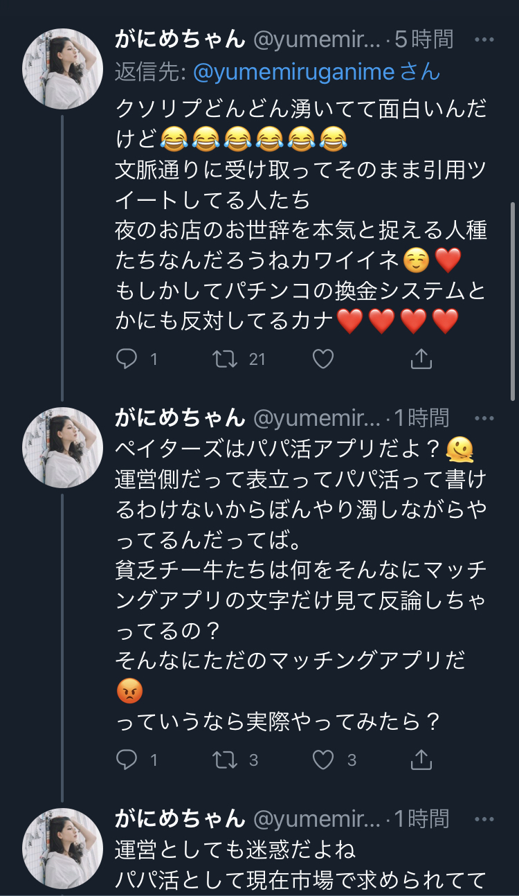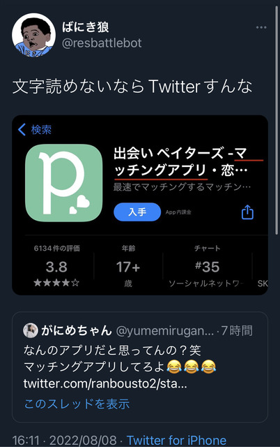 【画像】パパ活女さん、男性に痛いところを突かれ発狂し長文でブチギレ 2022/8/9 キニ速 1:風吹けば名無し :2022/08/08(月) 22:18:02.13ID:LHmoyC8t0 2:風吹けば名無し :2022/08/08(月) 22:18:54.09ID:LHmoyC8t0 これが効いた模様 60:風吹けば名無し :2022/08/08(月) 22:30:41.24ID:q6bRZs2Ir >>2 キレキレで草 34:風吹けば名無し :2022/08/08(月) 22:26:25.48ID:+07BFURk0 >>2 草 4:風吹けば名無し :2022/08/08(月) 22:19:54.18ID:iRoroW0C0 >>2 ワロタw 続きを読む Source: キニ速