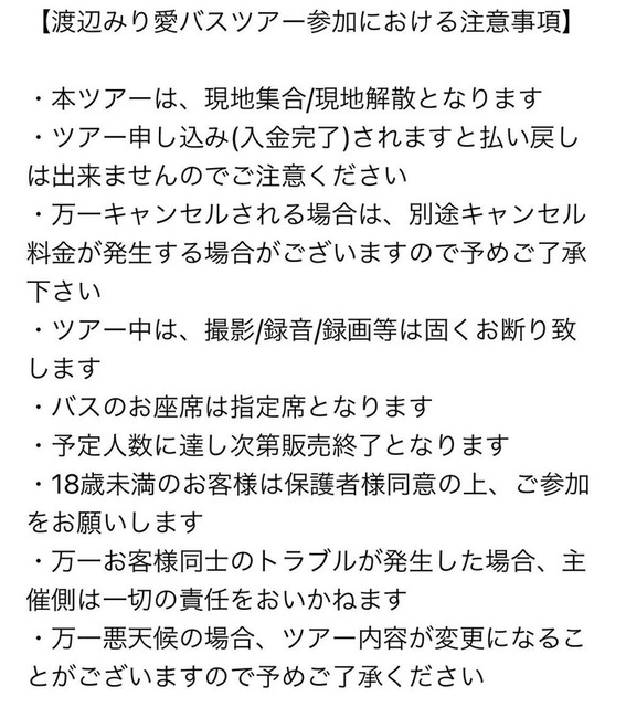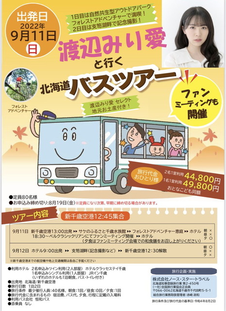 元ジャニーズ「7ORDER」萩谷慧悟と「草津温泉1泊2日の夏デート」を文春砲された元乃木坂46渡辺みり愛ですが、渡辺は9月11日から「北海道1泊2日ファンと行くバスツアー」を控えています??