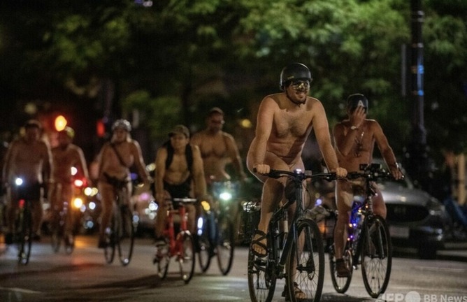 裸のサイクリスト集団、自転車の交通安全など訴え 米ボストン