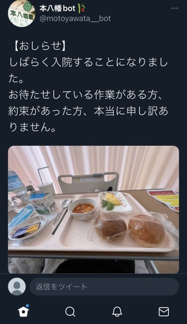 お待たせしている作業がある方、約束があった方、本当に申し訳ありません。 pic.twitter.com/KYdYbWD1ZX— 本八幡bot?? (@motoyawata__bot) July 12, 2022