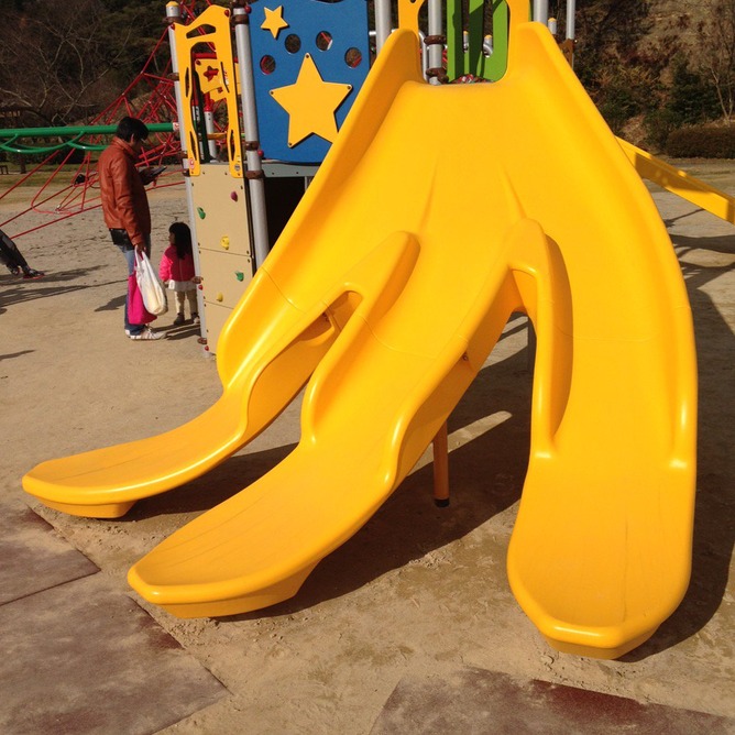 滑り台の対象年齢は6~12歳で、側面にはコースを決めてから足をそろえて滑るよう促すシールも貼られている。ただ、実際には対象年齢未満と思われる幼児も多く遊んでおり、コース中盤の分岐にぶつかりそうになり、保護者が手を添えてサポートをする場面も見られた。
